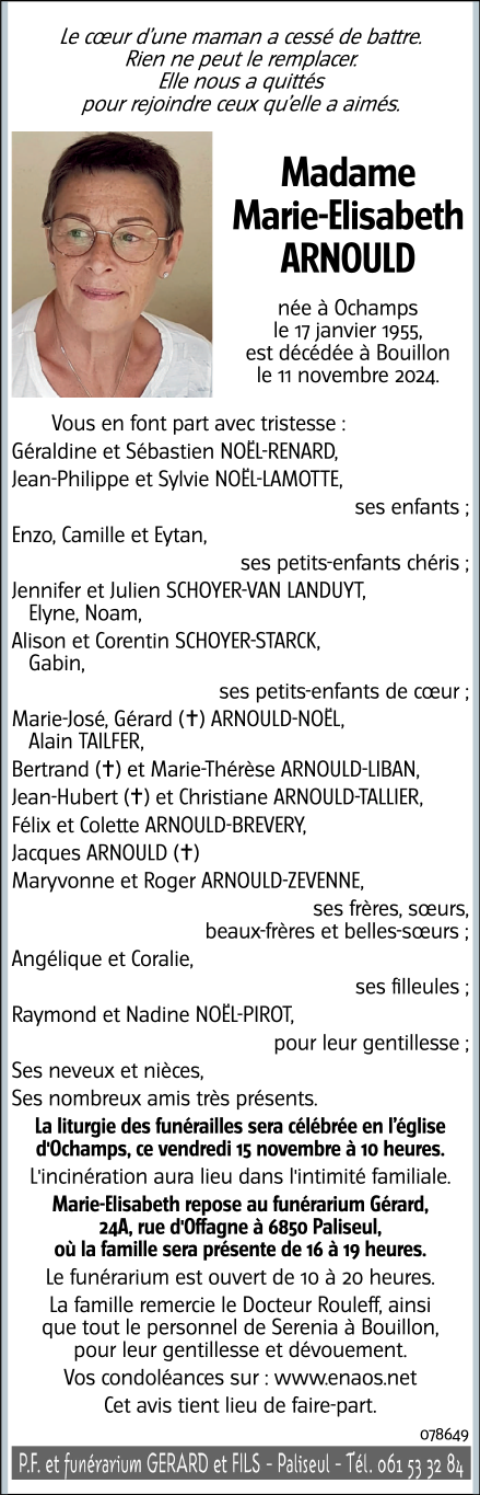 Fallecida en Bouillon (6830) el lunes, 11 de noviembre de 2024 a la edad de 69 años
