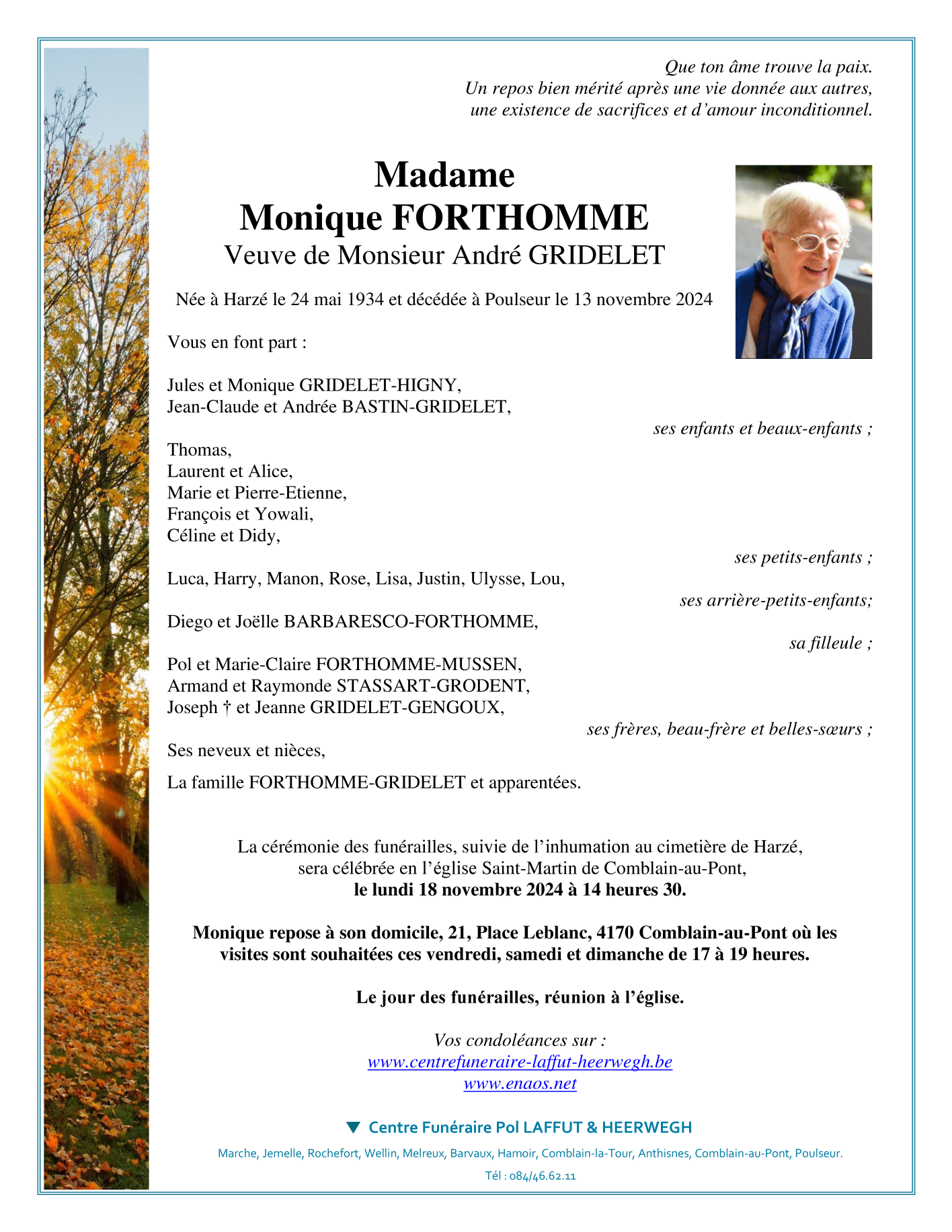 Décédée à Poulseur (4171) le mercredi 13 novembre 2024 à l'âge de 90 ans