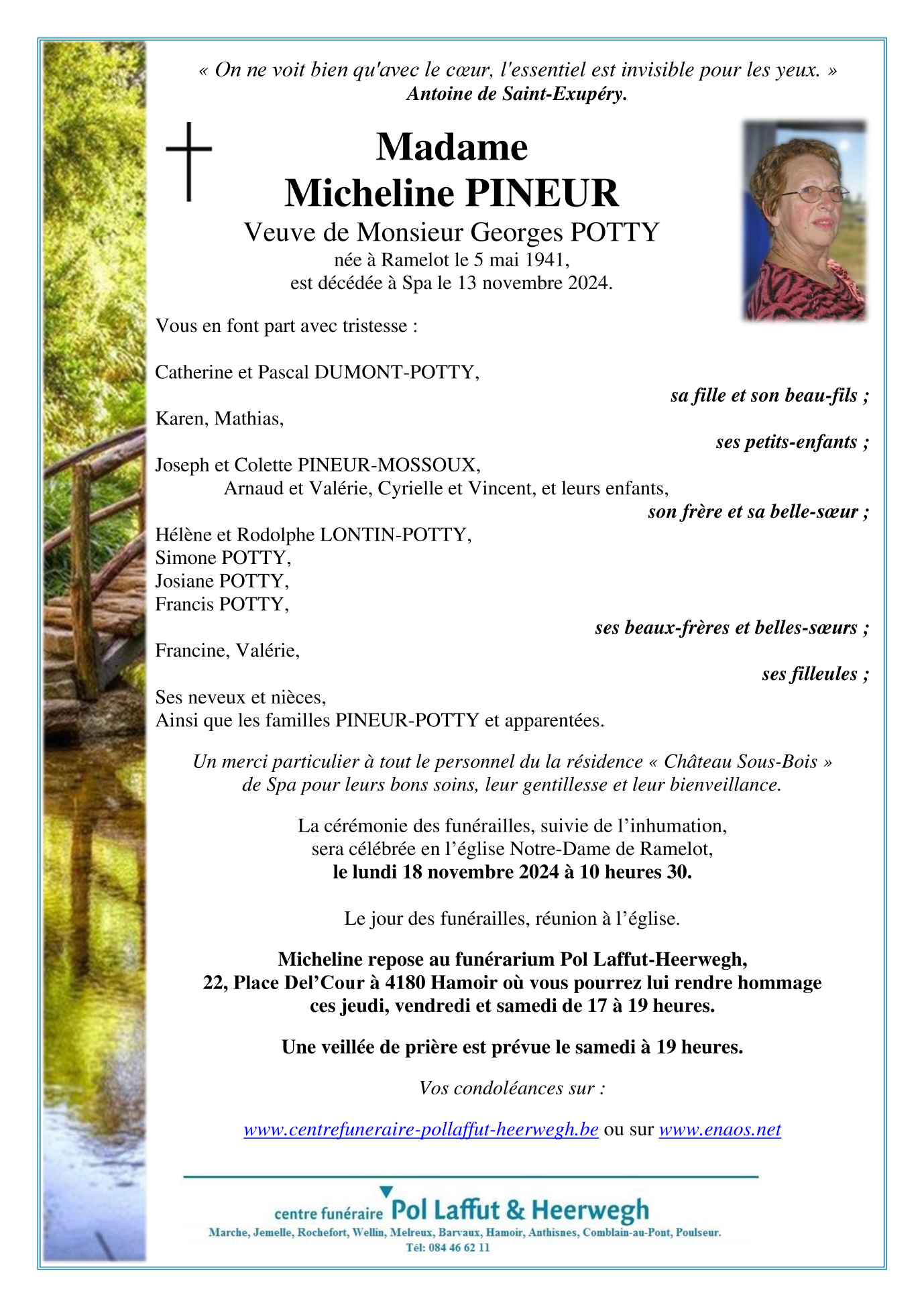Décédée à Spa (4900) le mercredi 13 novembre 2024 à l'âge de 83 ans