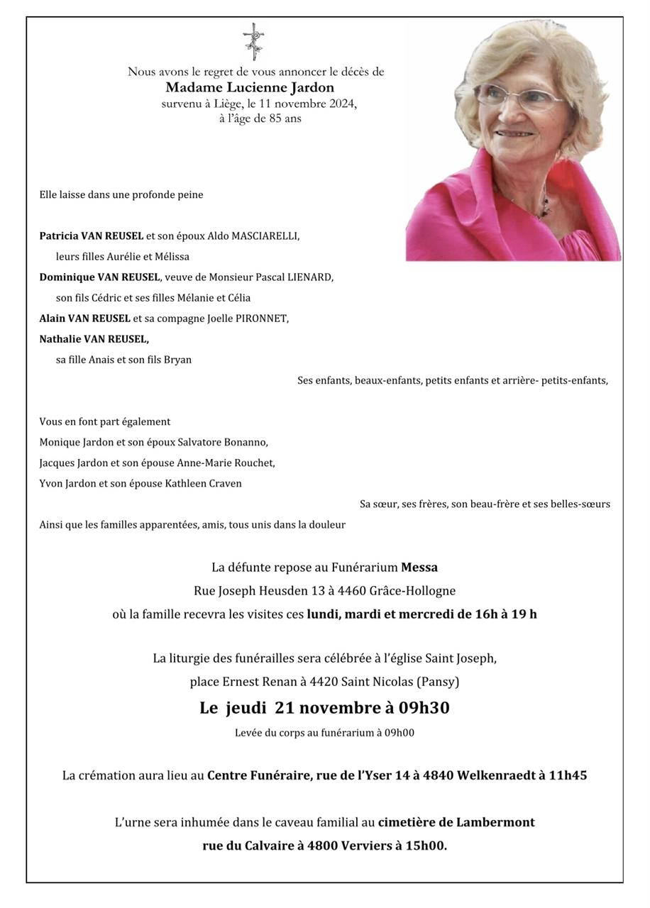 Décédée à Liège (4000) le lundi 11 novembre 2024 à l'âge de 85 ans