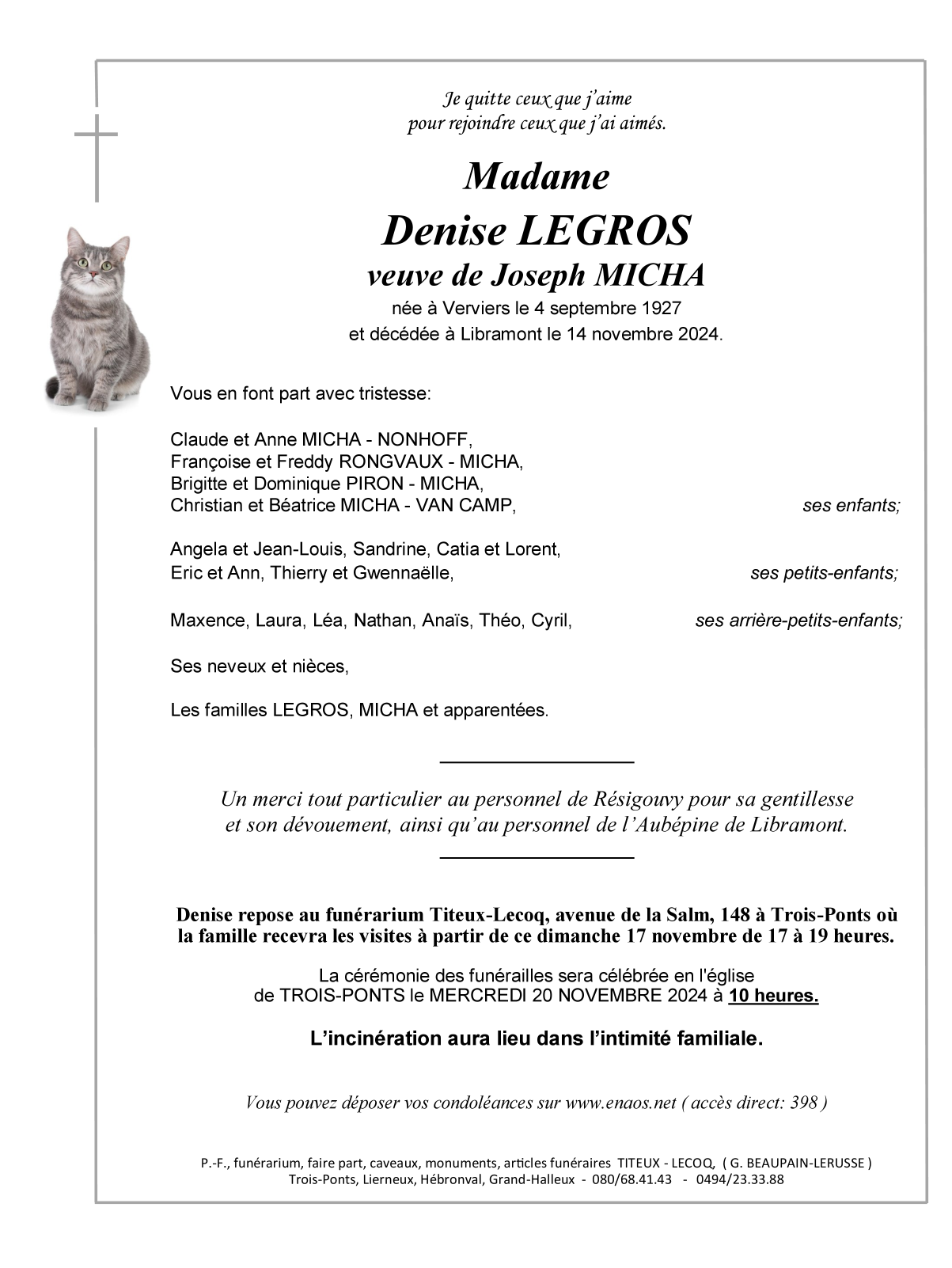 Décédée à Libramont (6800) le jeudi 14 novembre 2024 à l'âge de 97 ans