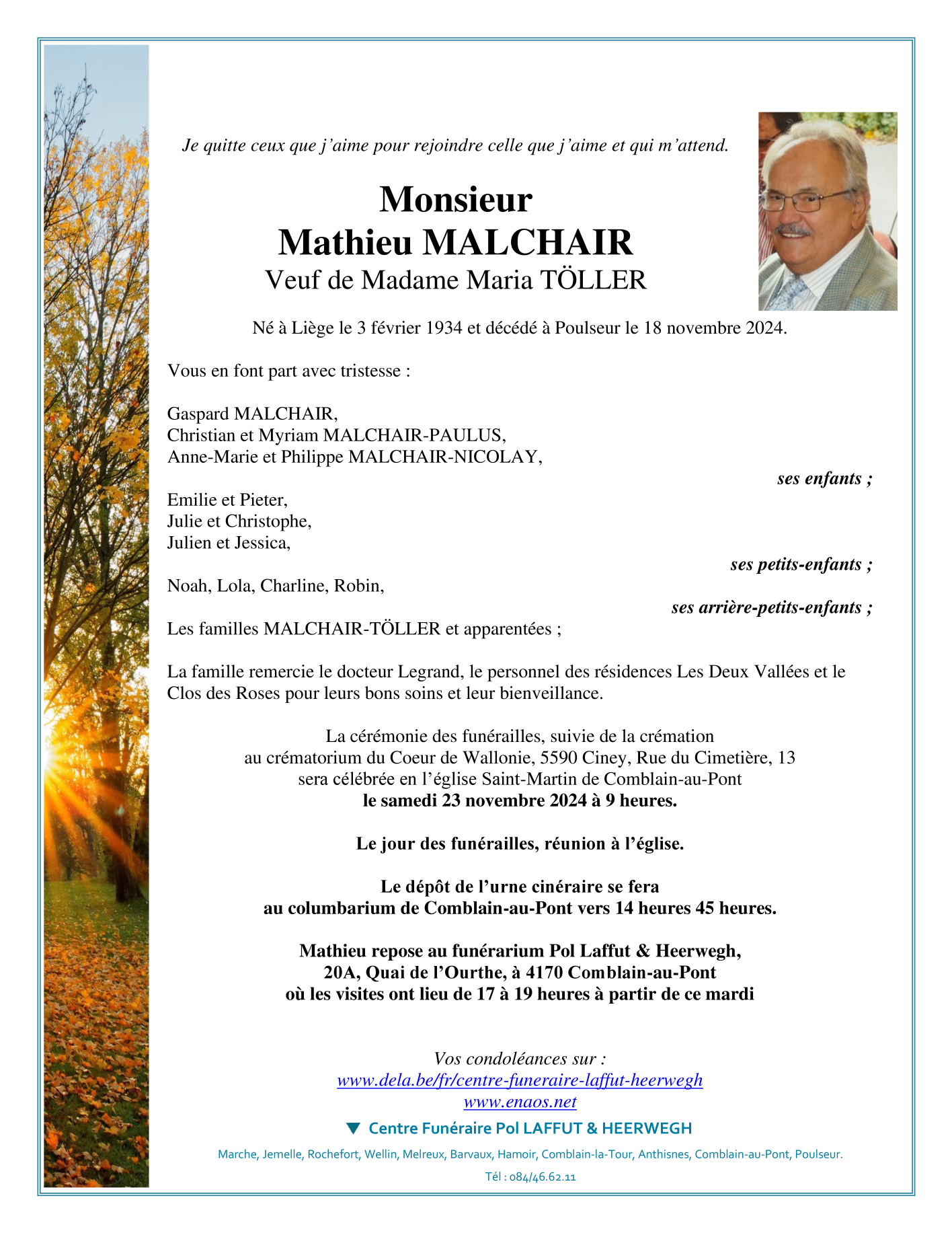 Décédé à Poulseur (4171) le lundi 18 novembre 2024 à l'âge de 90 ans