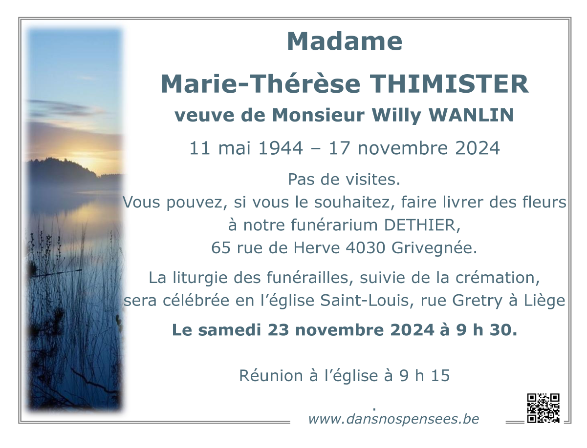 Décédée à Chênée (4032) le dimanche 17 novembre 2024 à l'âge de 80 ans