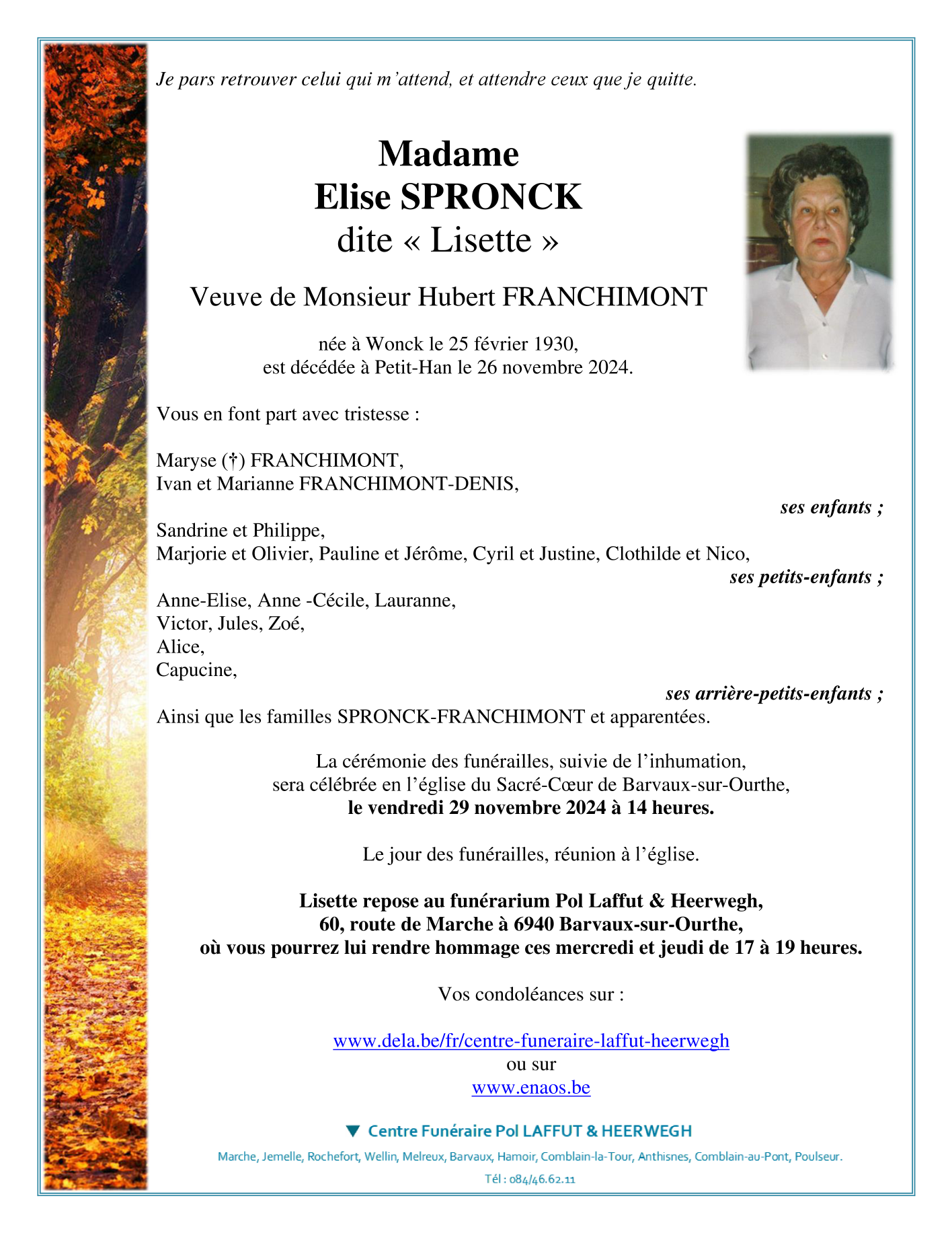 Fallecida en Petit-Han (6940) el martes, 26 de noviembre de 2024 a la edad de 94 años