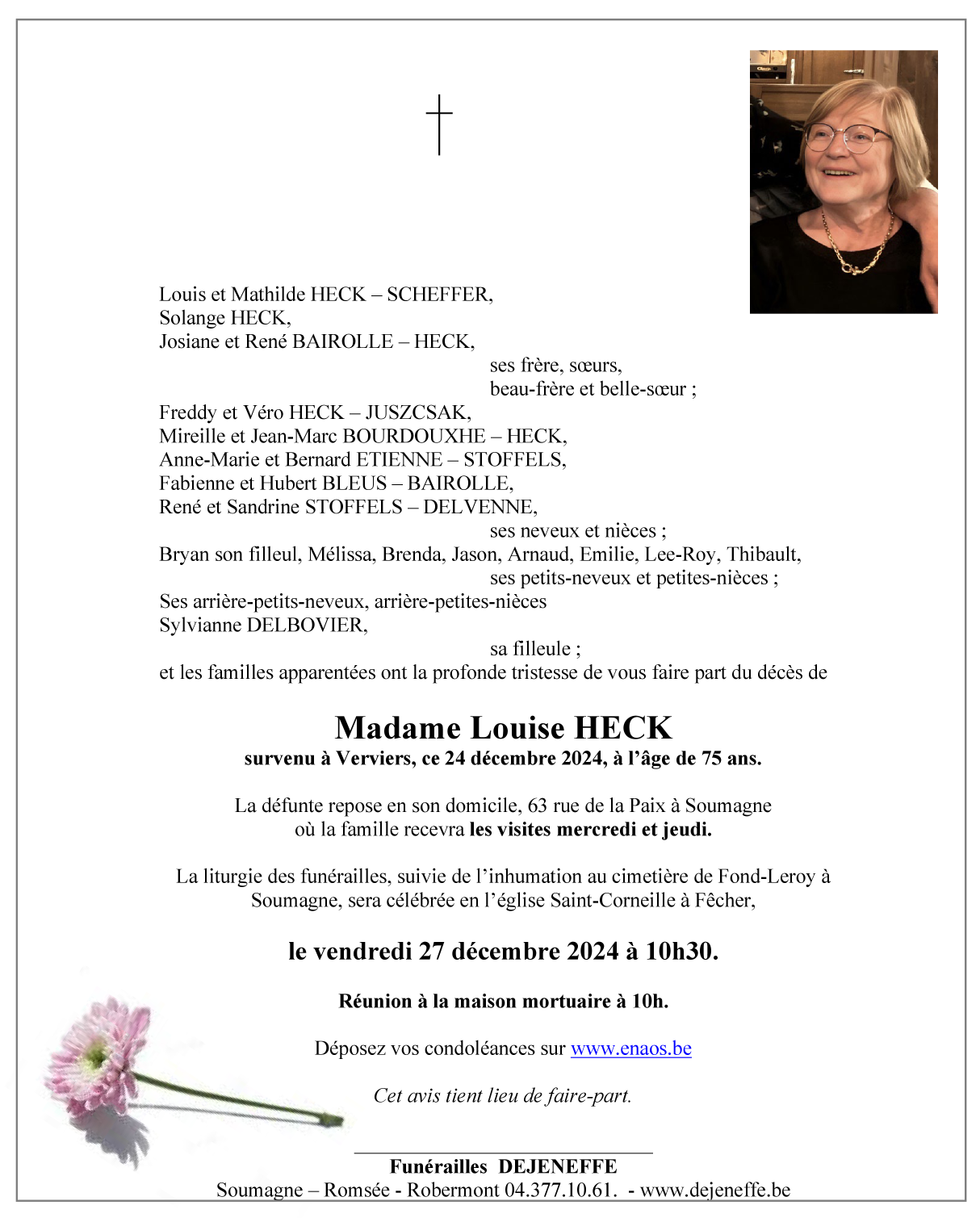 Décédée à Verviers (4800) le mardi 24 décembre 2024 à l'âge de 75 ans