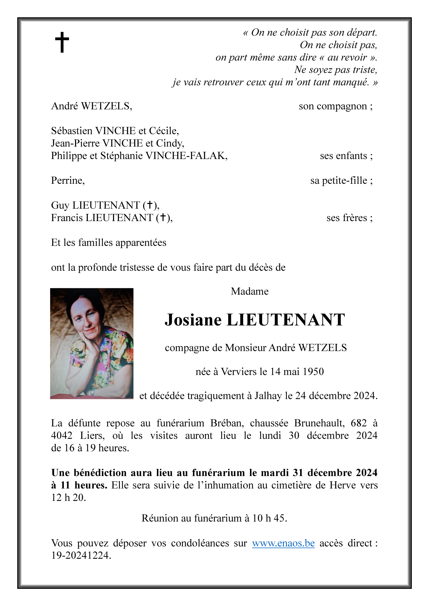 Madame Josiane LIEUTENANT compagne de André WETZELS