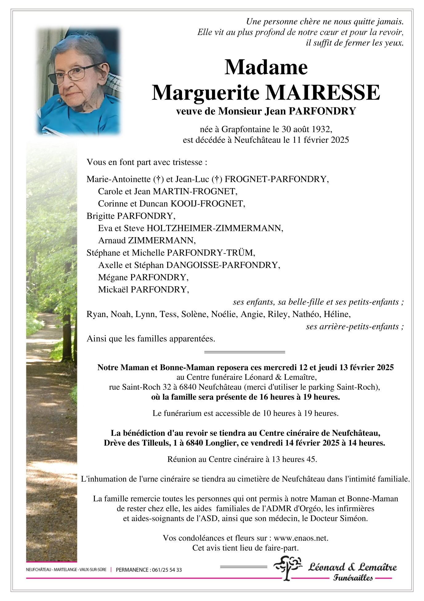 Fallecida en Neufchâteau (6840) el martes, 11 de febrero de 2025 a la edad de 92 años