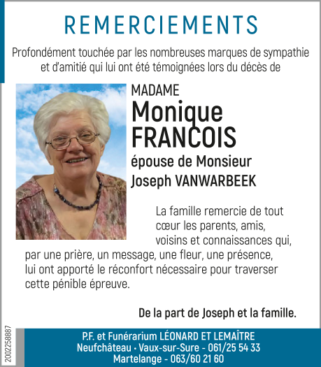 Décédée à Bastogne (6600) le vendredi 21 février 2025 à l'âge de 84 ans