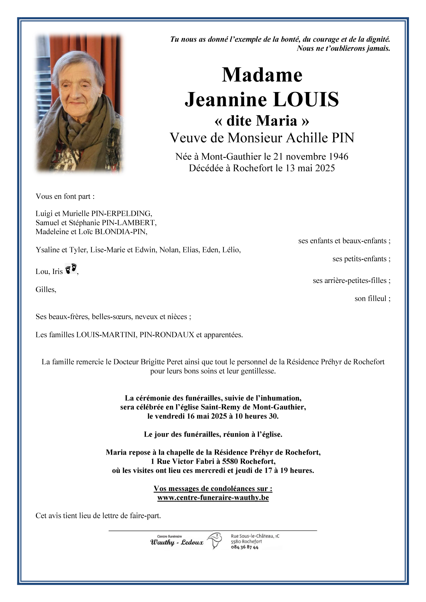 Fallecida en Rochefort (5580) el martes, 13 de mayo de 2025 a la edad de 78 años