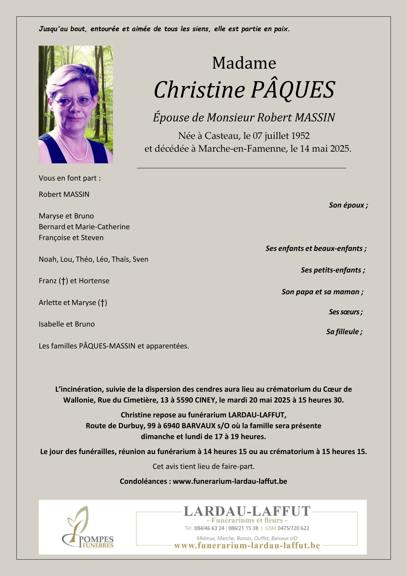 Décédée à Marche-en-Famenne (6900) le mercredi 14 mai 2025 à l'âge de 72 ans