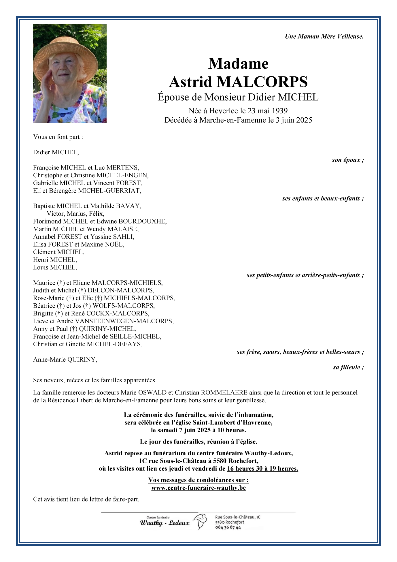 Décédée à Marche-en-Famenne (6900) le mardi 3 juin 2025 à l'âge de 86 ans