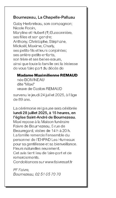 Fallecida en Bournezeau (85480, Francia) el jueves, 24 de julio de 2025 a la edad de 89 años