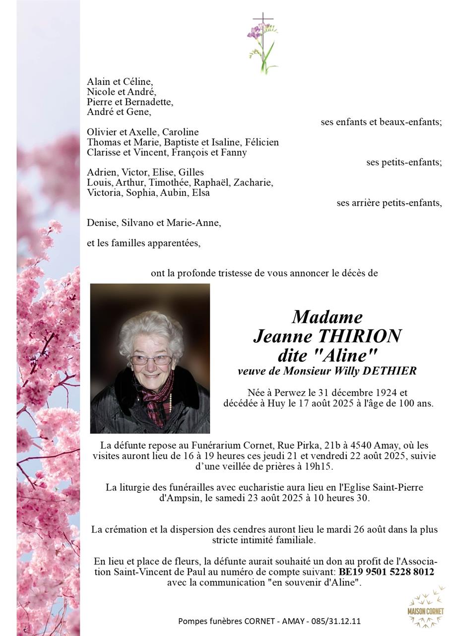 Décédée à Huy (4500) le dimanche 17 août 2025 à l'âge de 100 ans