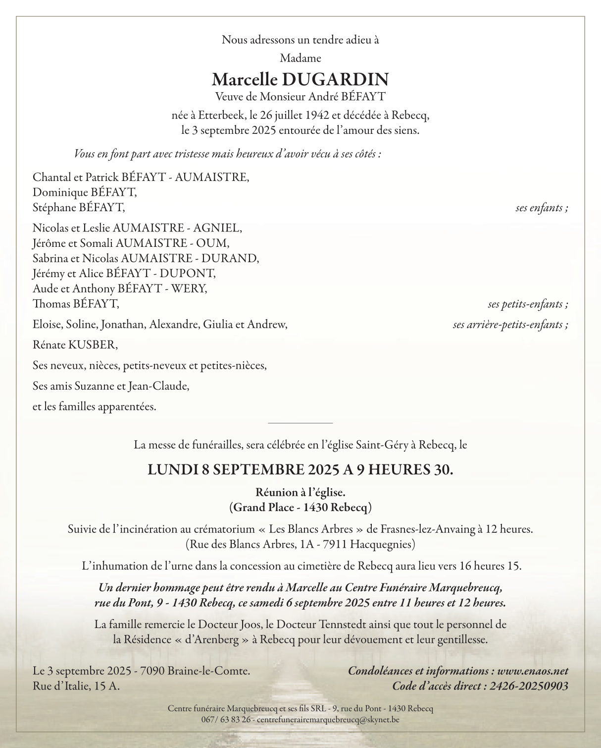 Décédée à Rebecq (1430) le mercredi 3 septembre 2025 à l'âge de 83 ans