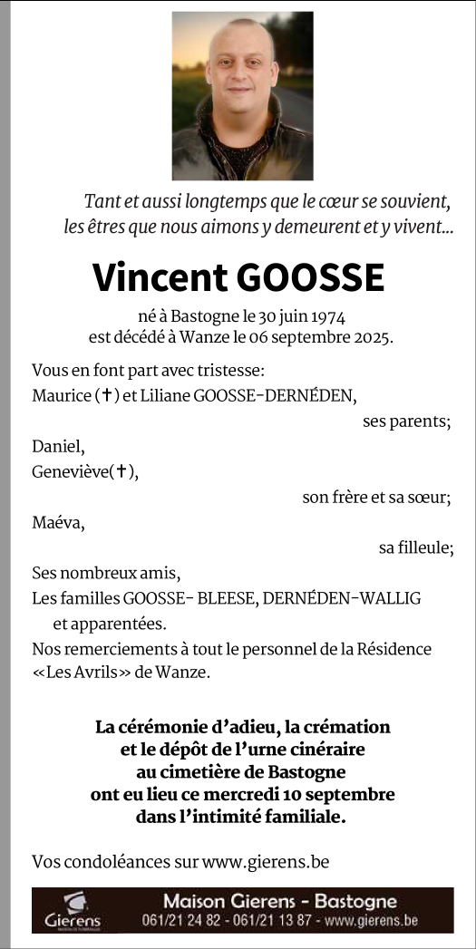 Décédé à Wanze (4520) le samedi 6 septembre 2025 à l'âge de 51 ans