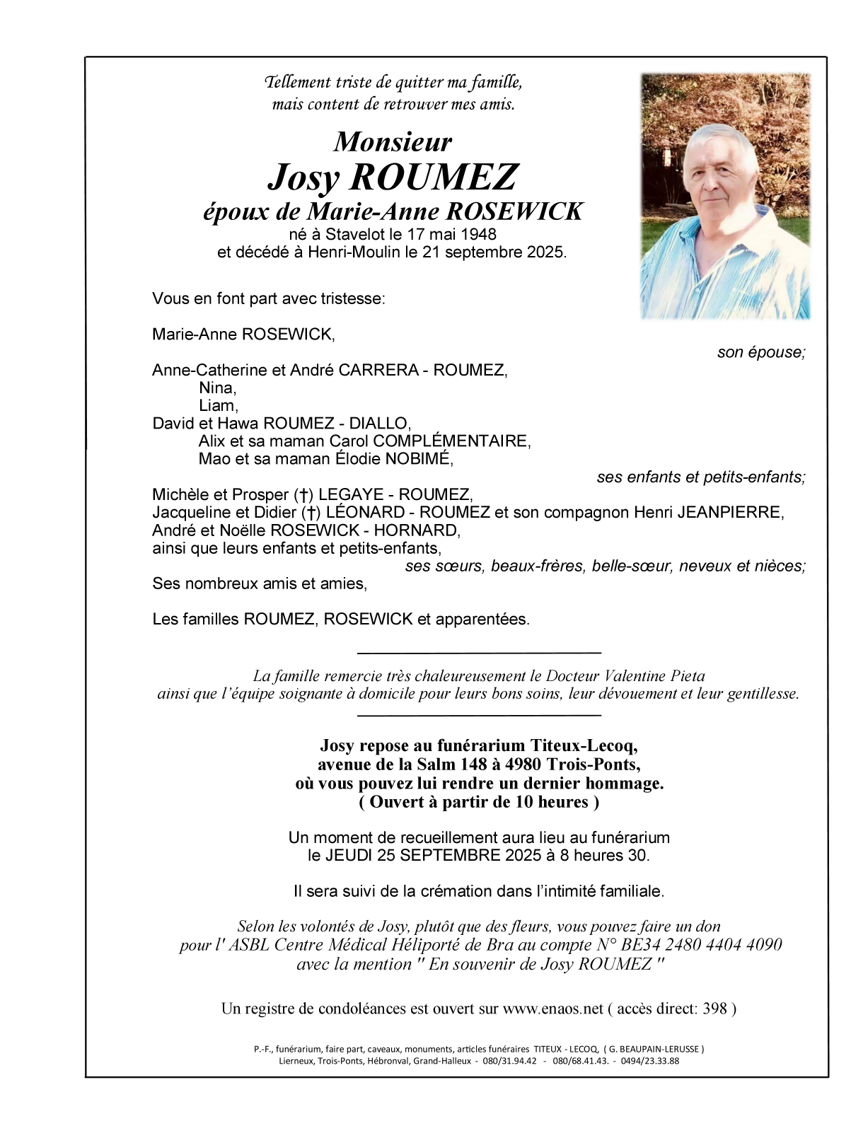 Fallecido en Trois-Ponts (4980) el domingo, 21 de septiembre de 2025 a la edad de 77 años