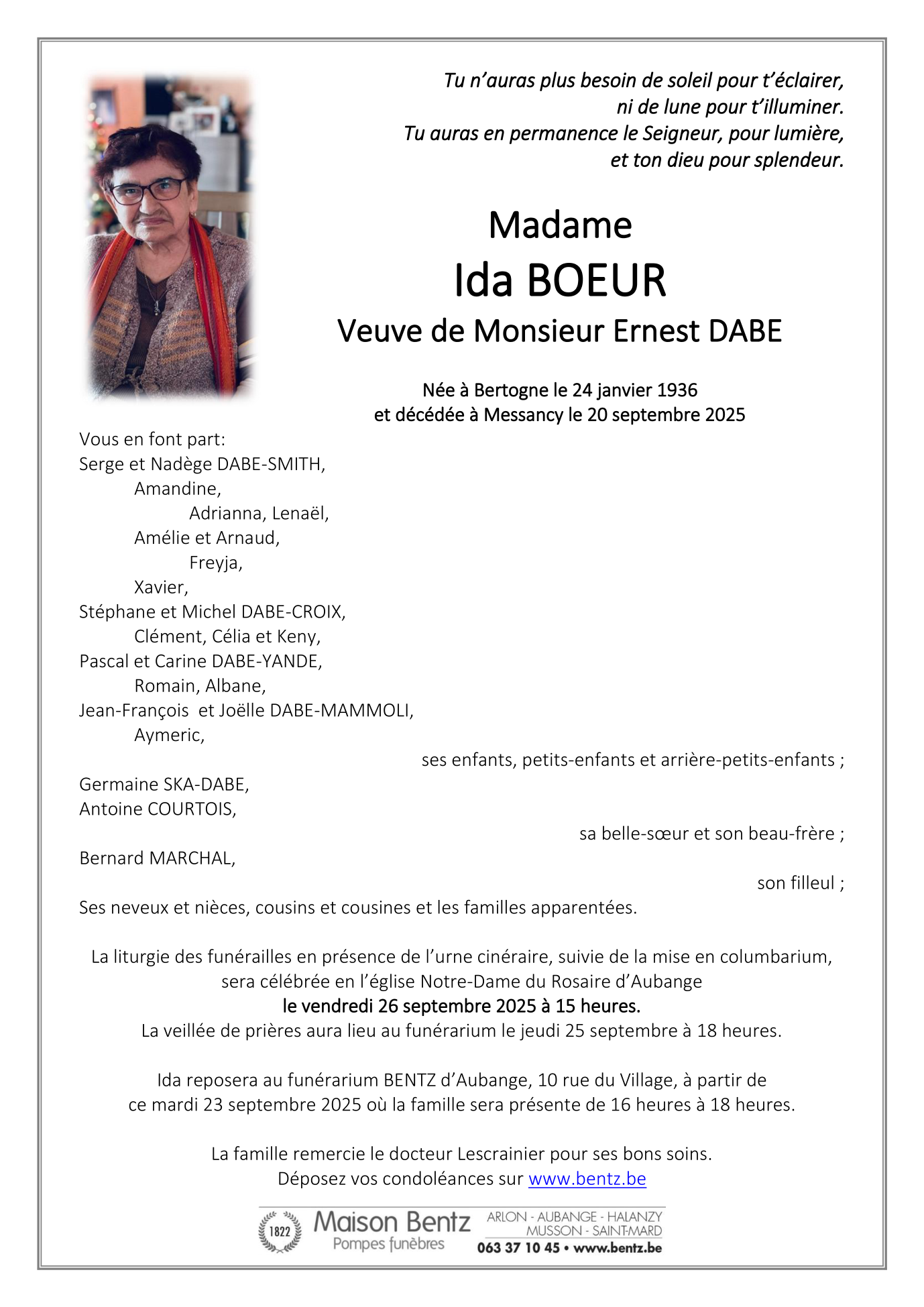 Décédée à Messancy (6780) le samedi 20 septembre 2025 à l'âge de 89 ans