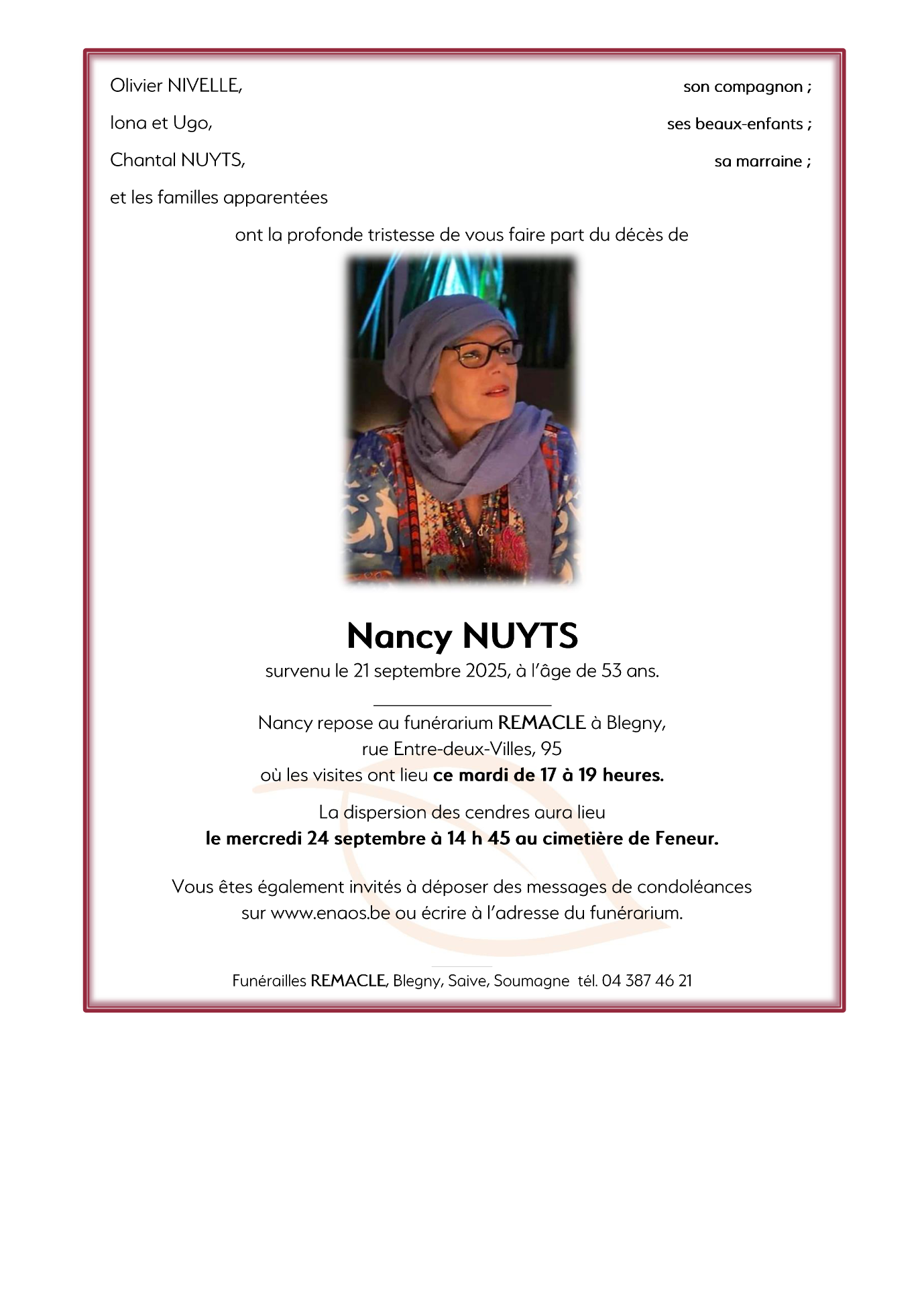 Décédée à Liège (4000) le dimanche 21 septembre 2025 à l'âge de 53 ans
