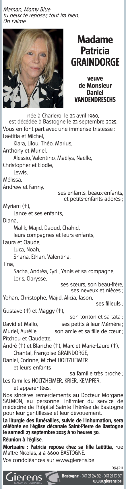 Décédée à Bastogne (6600) le mardi 23 septembre 2025 à l'âge de 65 ans