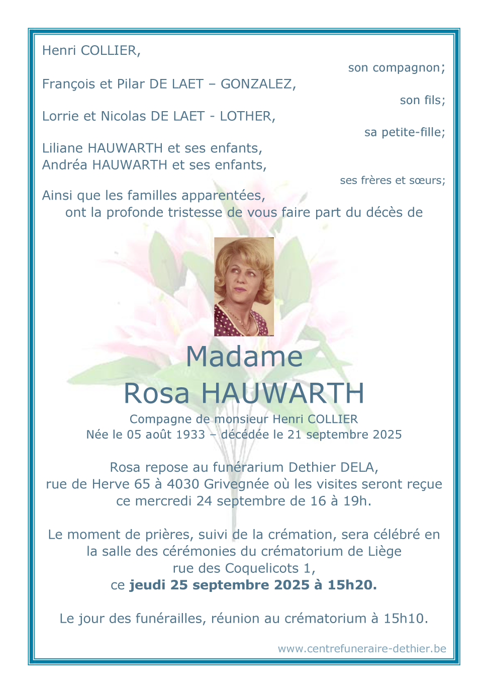 Décédée à Liège (4000) le dimanche 21 septembre 2025 à l'âge de 92 ans