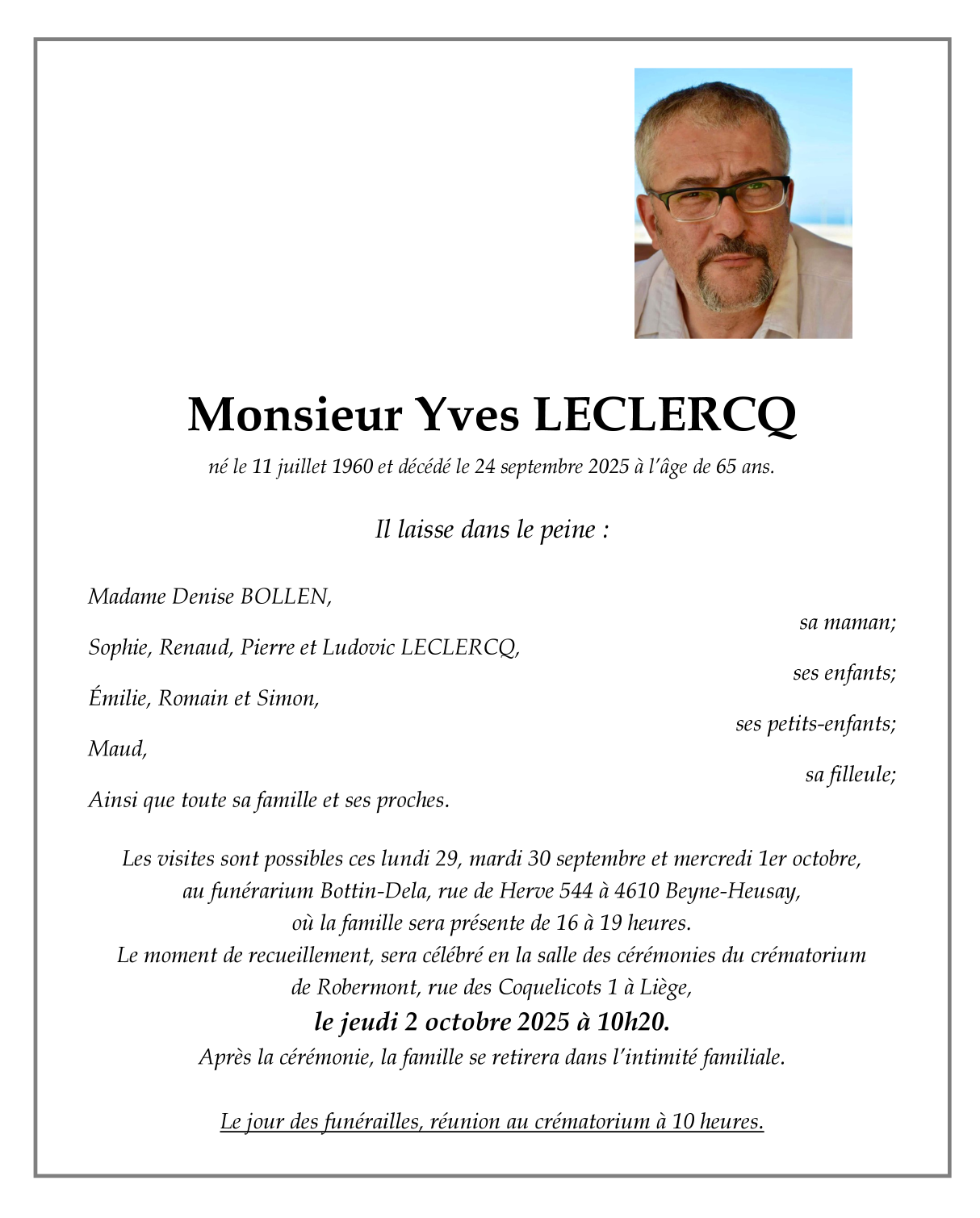 Décédé à Liège (4020) le mercredi 24 septembre 2025 à l'âge de 65 ans