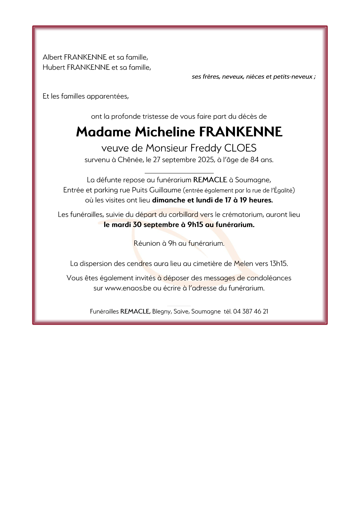 Overleden te Chênée (4032) op zaterdag 27 september 2025 op 83-jarige leeftijd