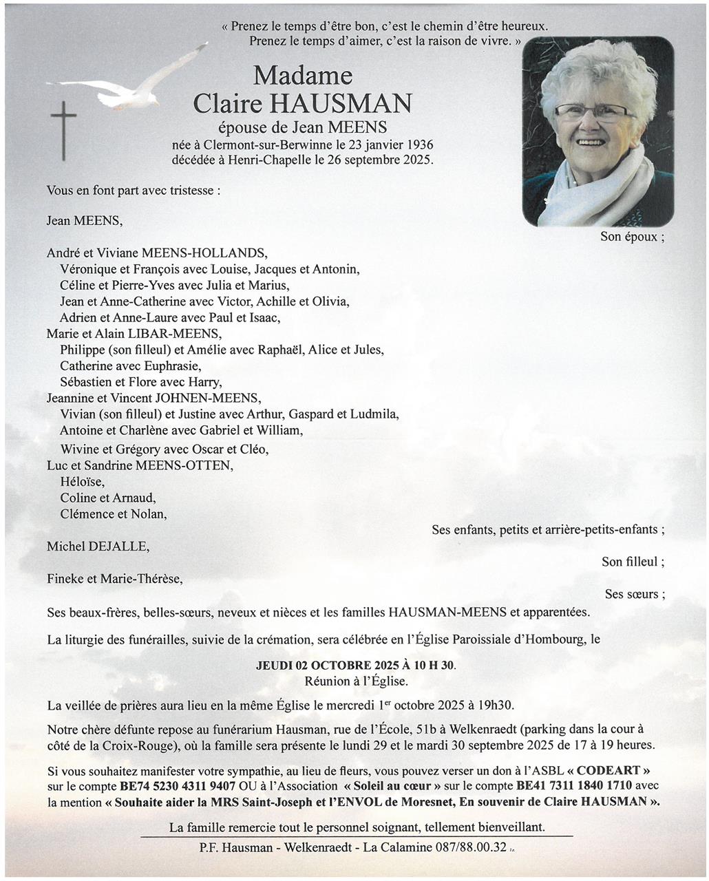 Décédée à Henri-Chapelle (4841) le vendredi 26 septembre 2025 à l'âge de 89 ans