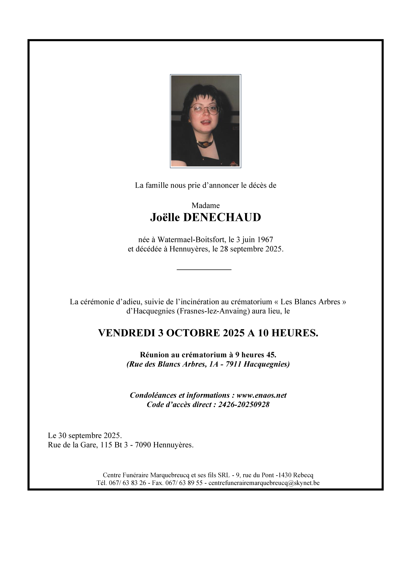 Décédée à Hennuyères (7090) le dimanche 28 septembre 2025 à l'âge de 58 ans