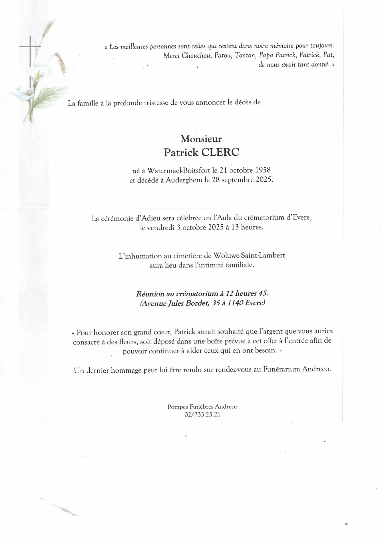 Décédé à Auderghem (1160) le dimanche 28 septembre 2025 à l'âge de 66 ans