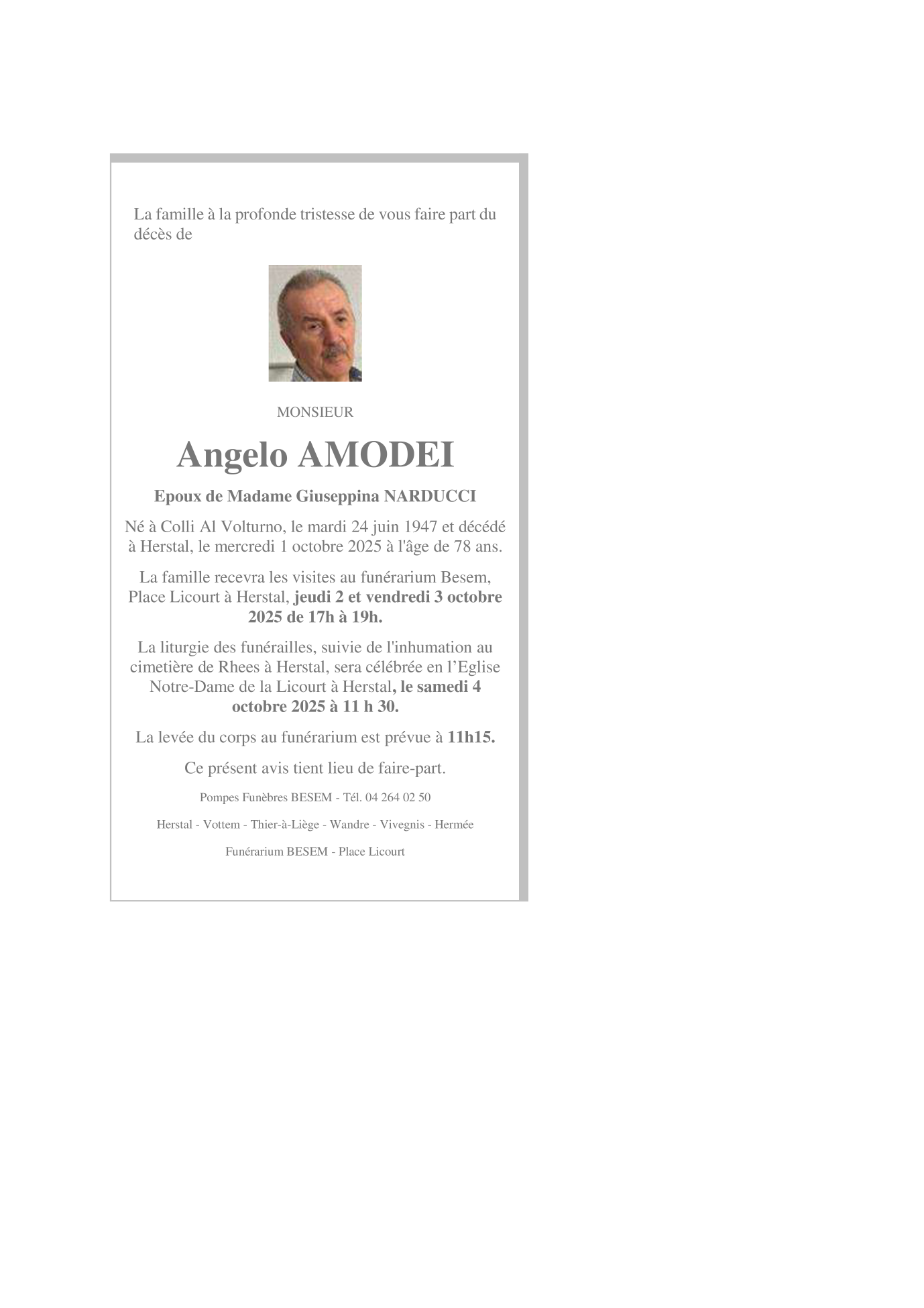 Décédé à Herstal (4040) le mercredi 1 octobre 2025 à l'âge de 78 ans