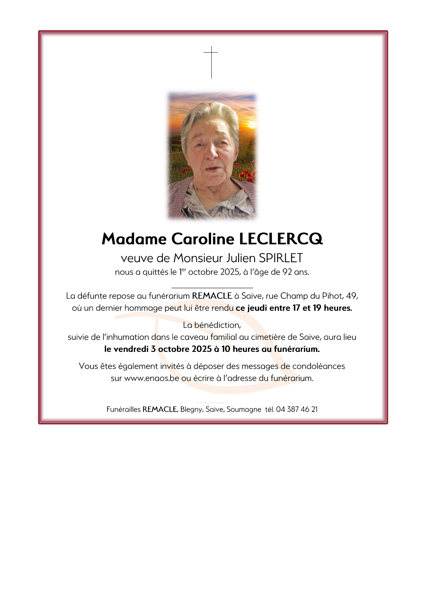 Décédée à Blegny (4670) le mercredi 1 octobre 2025 à l'âge de 92 ans