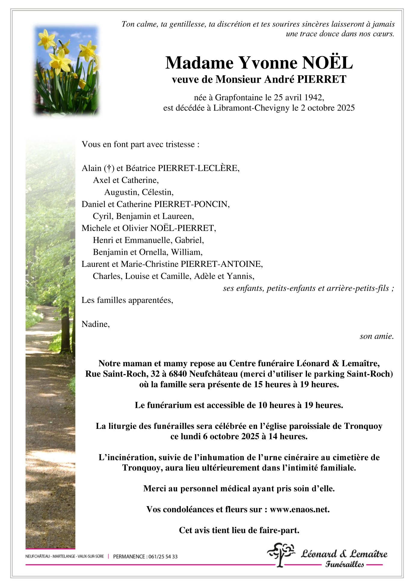 Née à Grapfontaine (6840) le samedi 25 avril 1942