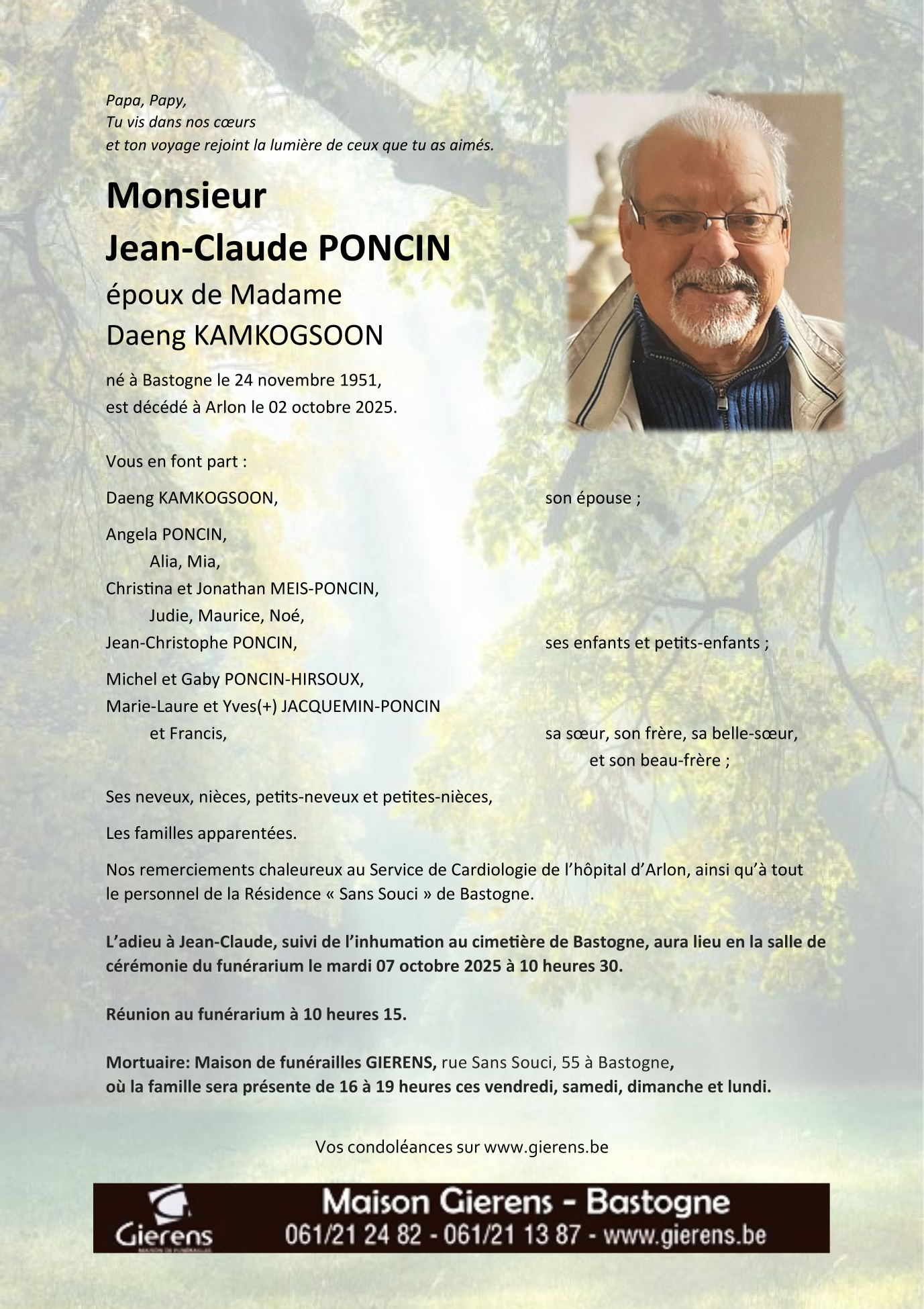 Décédé à Arlon (6700) le jeudi 2 octobre 2025 à l'âge de 73 ans