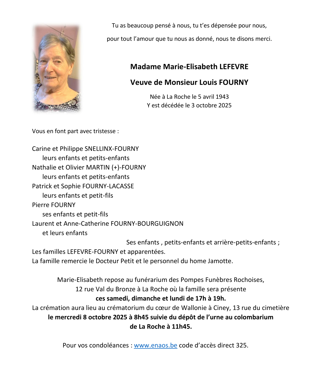 Décédée à La Roche-en-Ardenne (6980) le vendredi 3 octobre 2025 à l'âge de 82 ans