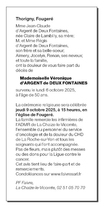 Madame Véronique d'ARGENT de DEUX FONTAINES