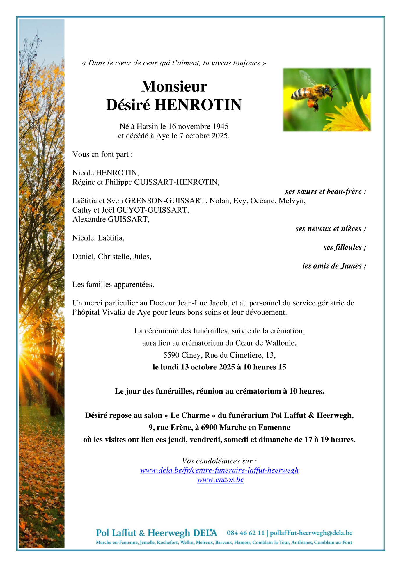 Né à Harsin (6950) le vendredi 16 novembre 1945