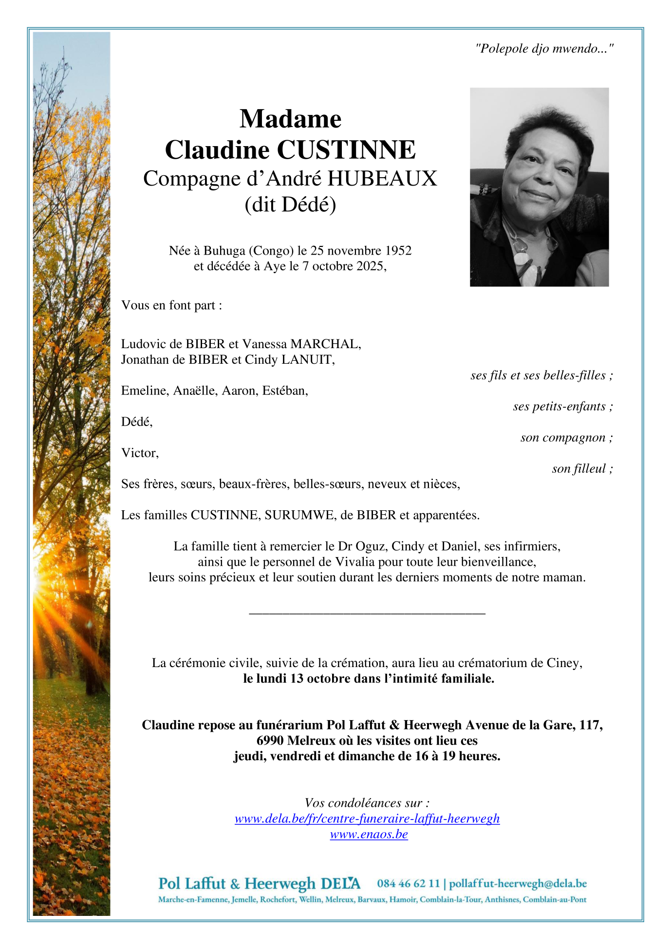 Décédée à Aye (6900) le mardi 7 octobre 2025 à l'âge de 72 ans