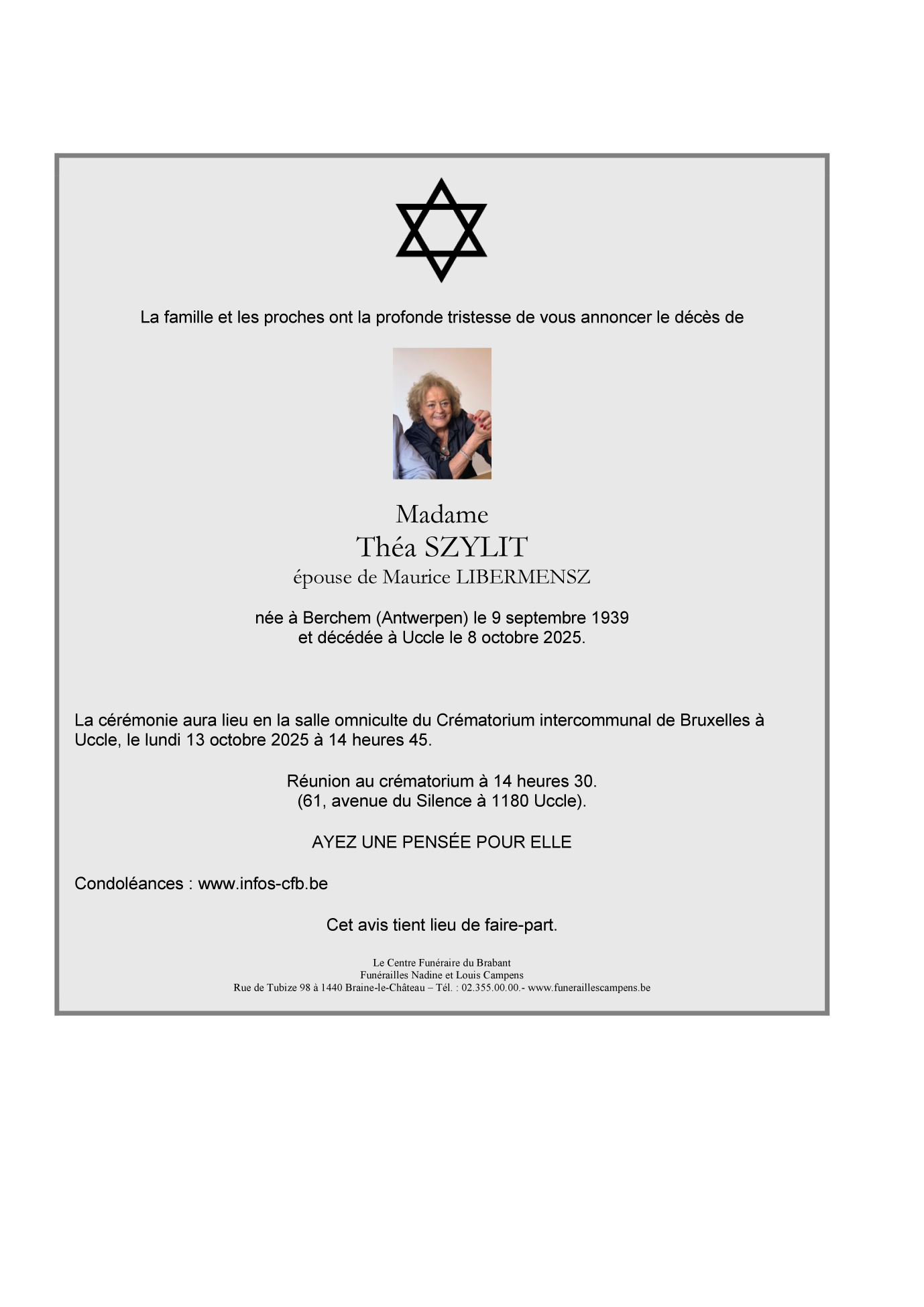 Décédée à Uccle (1180) le mercredi 8 octobre 2025 à l'âge de 86 ans