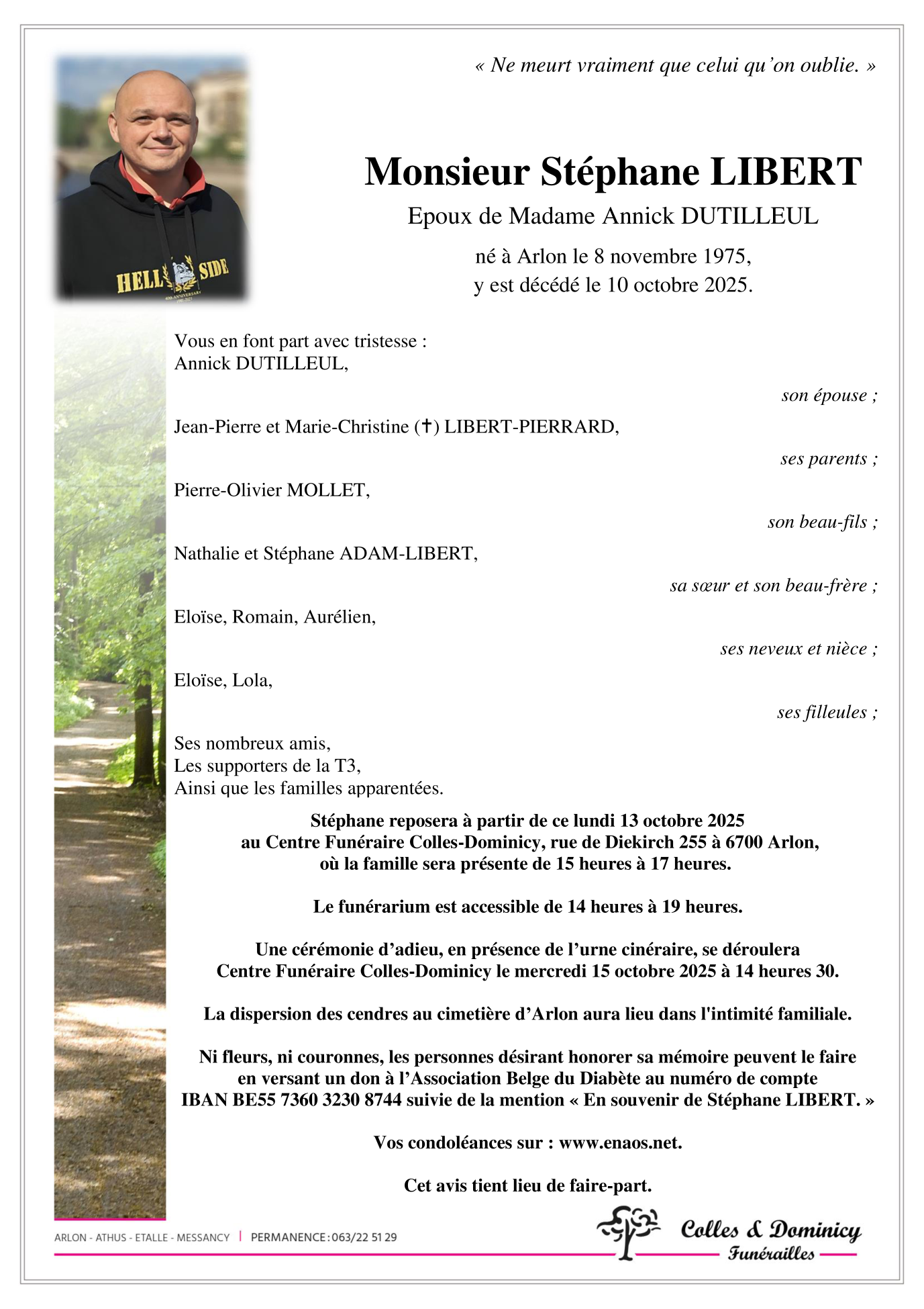 Décédé à Arlon (6700) le vendredi 10 octobre 2025 à l'âge de 49 ans