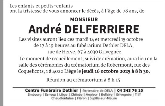 Décédé à Liège (4020) le jeudi 9 octobre 2025 à l'âge de 78 ans