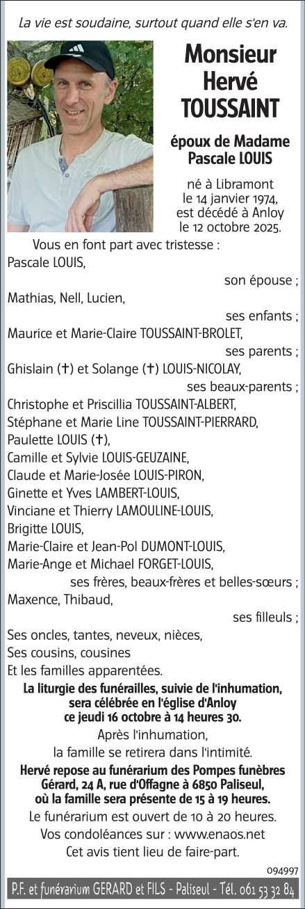Décédé à Anloy (6890) le lundi 13 octobre 2025 à l'âge de 51 ans