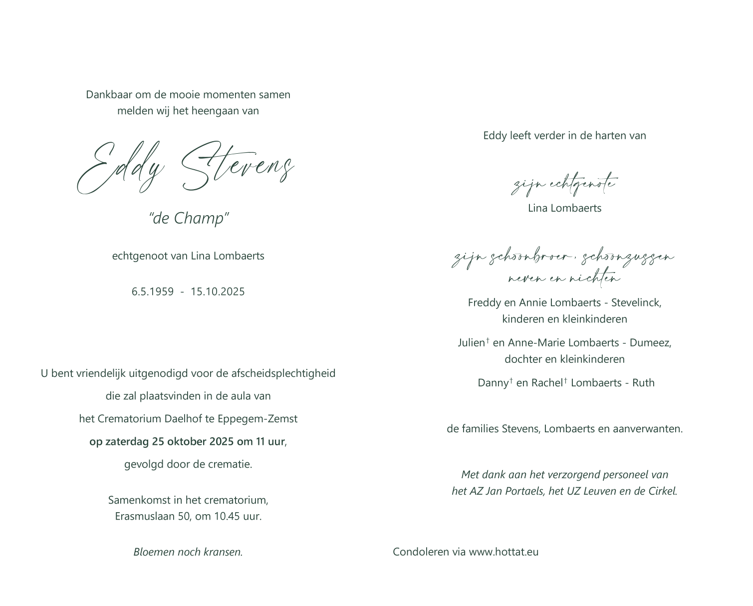 Fallecido en Vilvoorde (1800) el miércoles, 15 de octubre de 2025 a la edad de 66 años