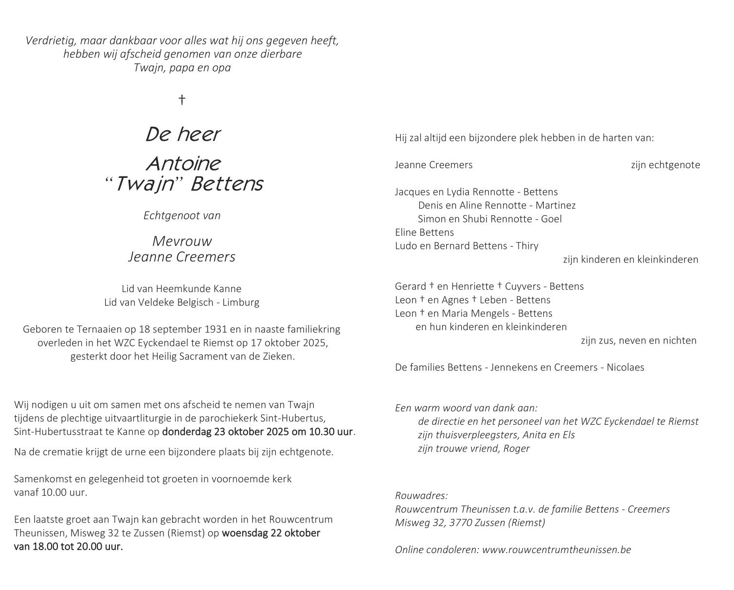 Décédé à Riemst (3770) le vendredi 17 octobre 2025 à l'âge de 95 ans