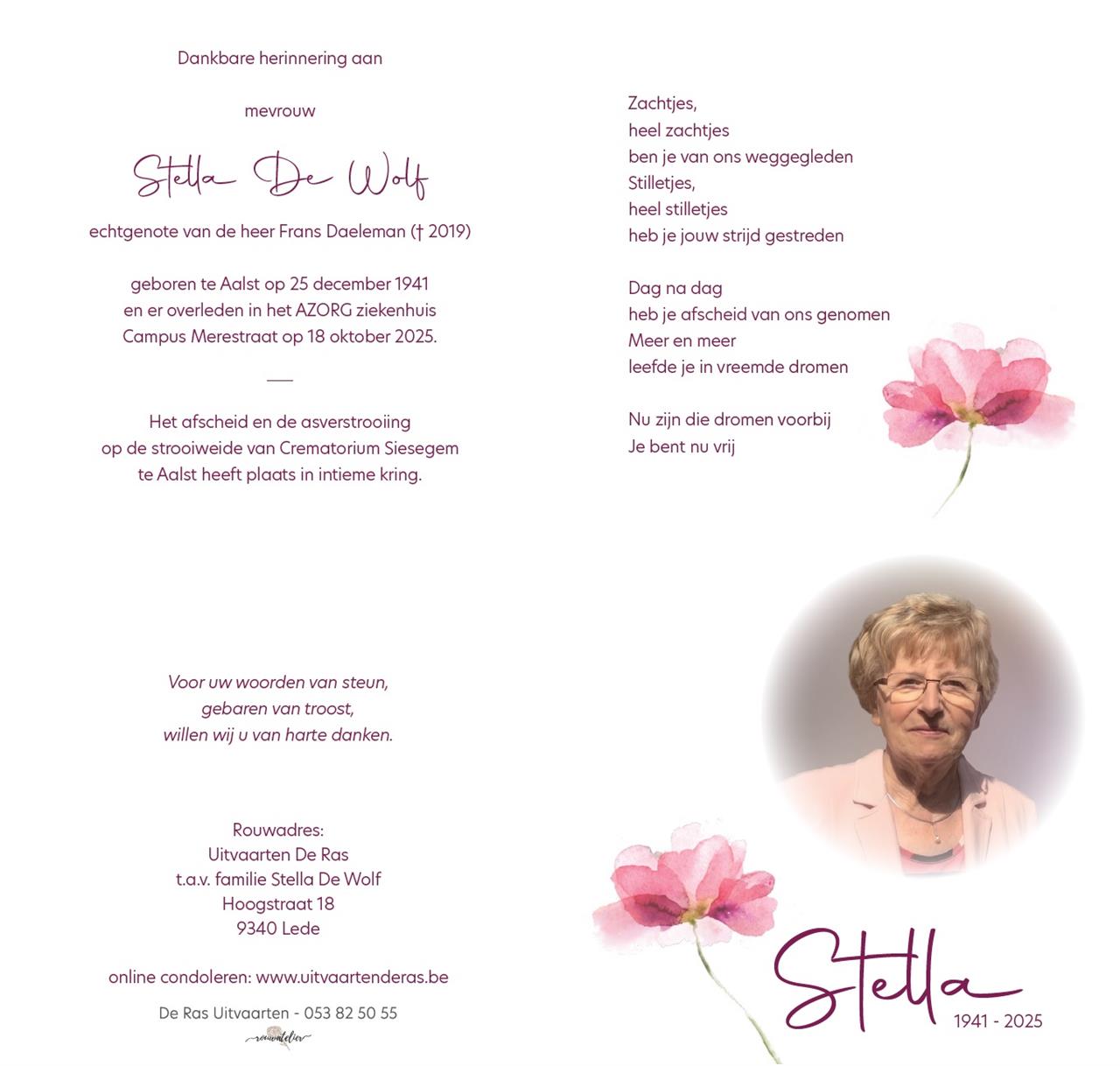 Décédée à Aalst (9300) le samedi 18 octobre 2025 à l'âge de 83 ans