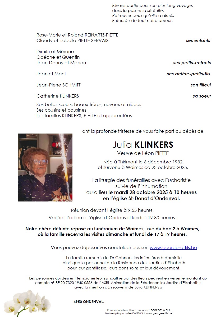 Madame Julia KLINKERS veuve de Léon PIETTE