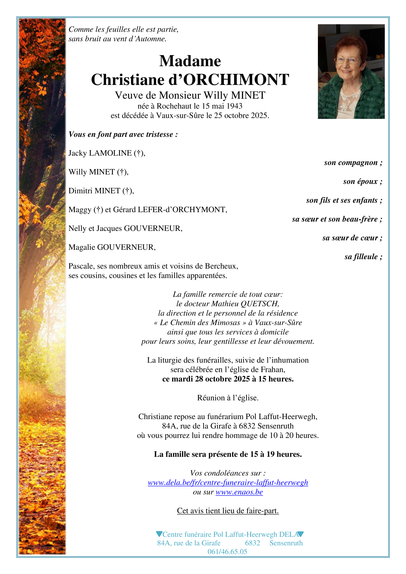 Overleden te Vaux-sur-Sure (6640) op zaterdag 25 oktober 2025 op 82-jarige leeftijd