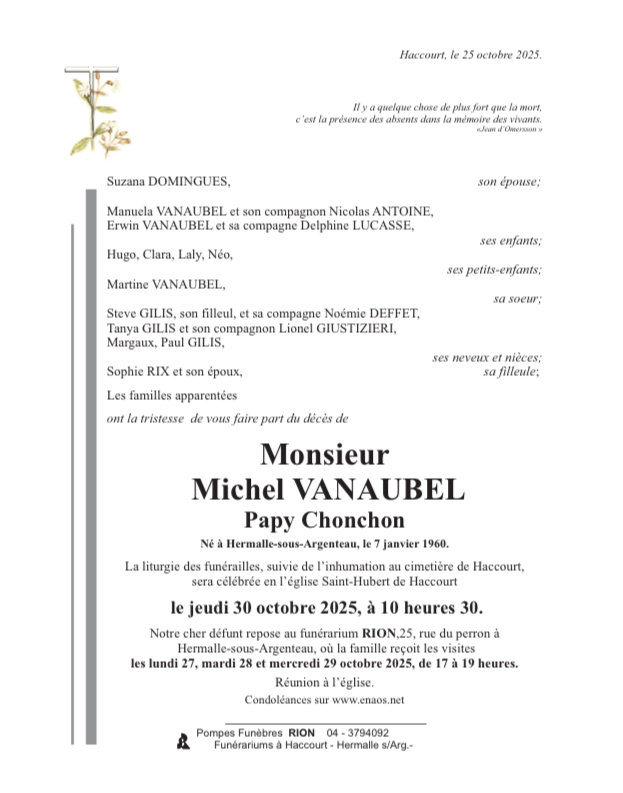 Décédé à Hermalle-sous-Argenteau (4681) le samedi 25 octobre 2025 à l'âge de 65 ans