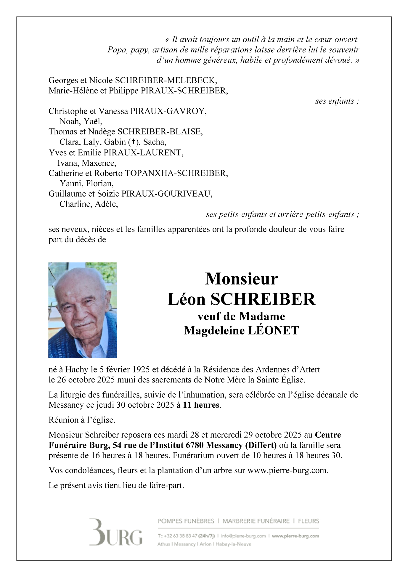Décédé à Attert (6717) le dimanche 26 octobre 2025 à l'âge de 100 ans