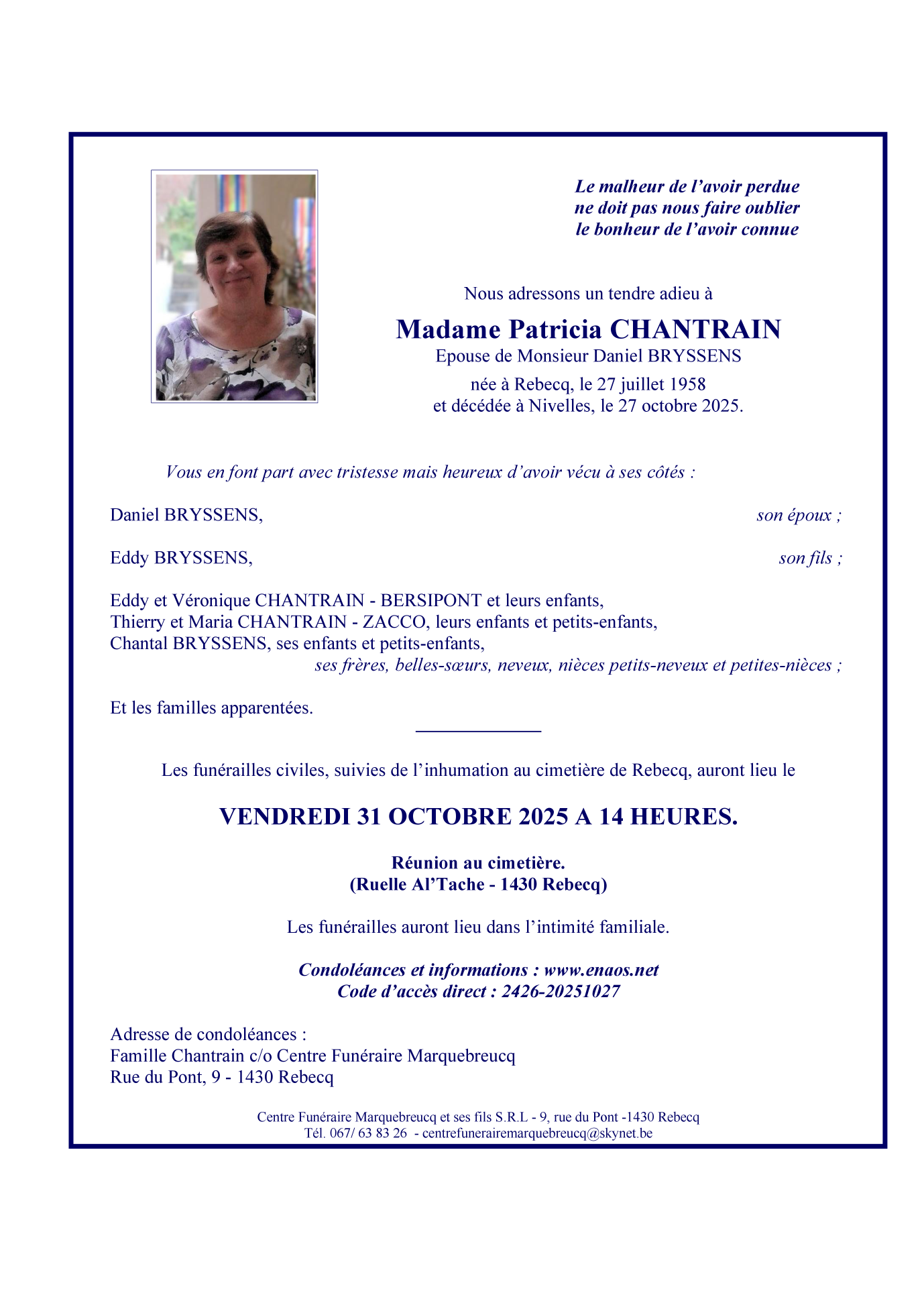 Décédée à Nivelles (1400) le lundi 27 octobre 2025 à l'âge de 67 ans