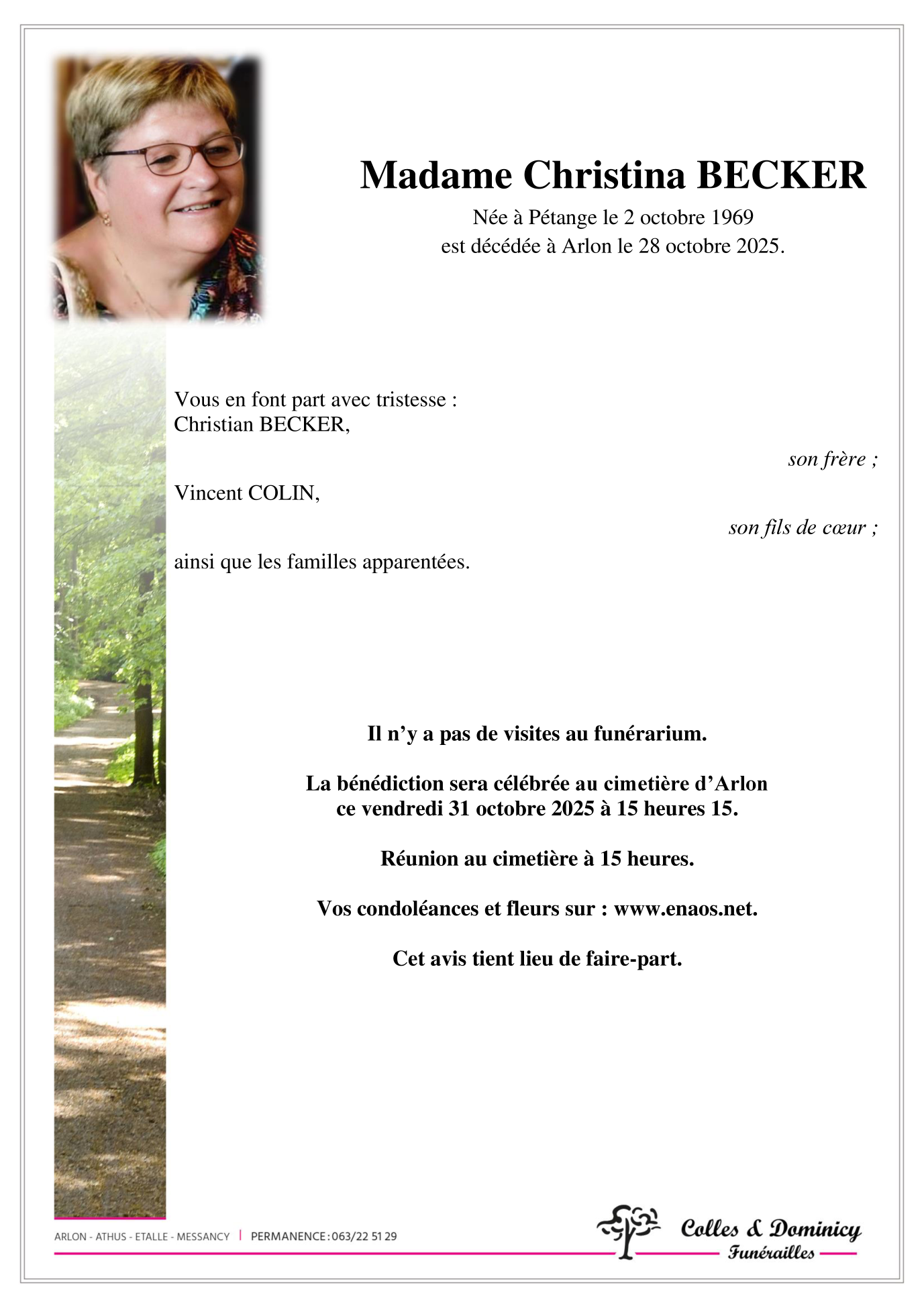 Décédée à Arlon (6700) le mardi 28 octobre 2025 à l'âge de 56 ans